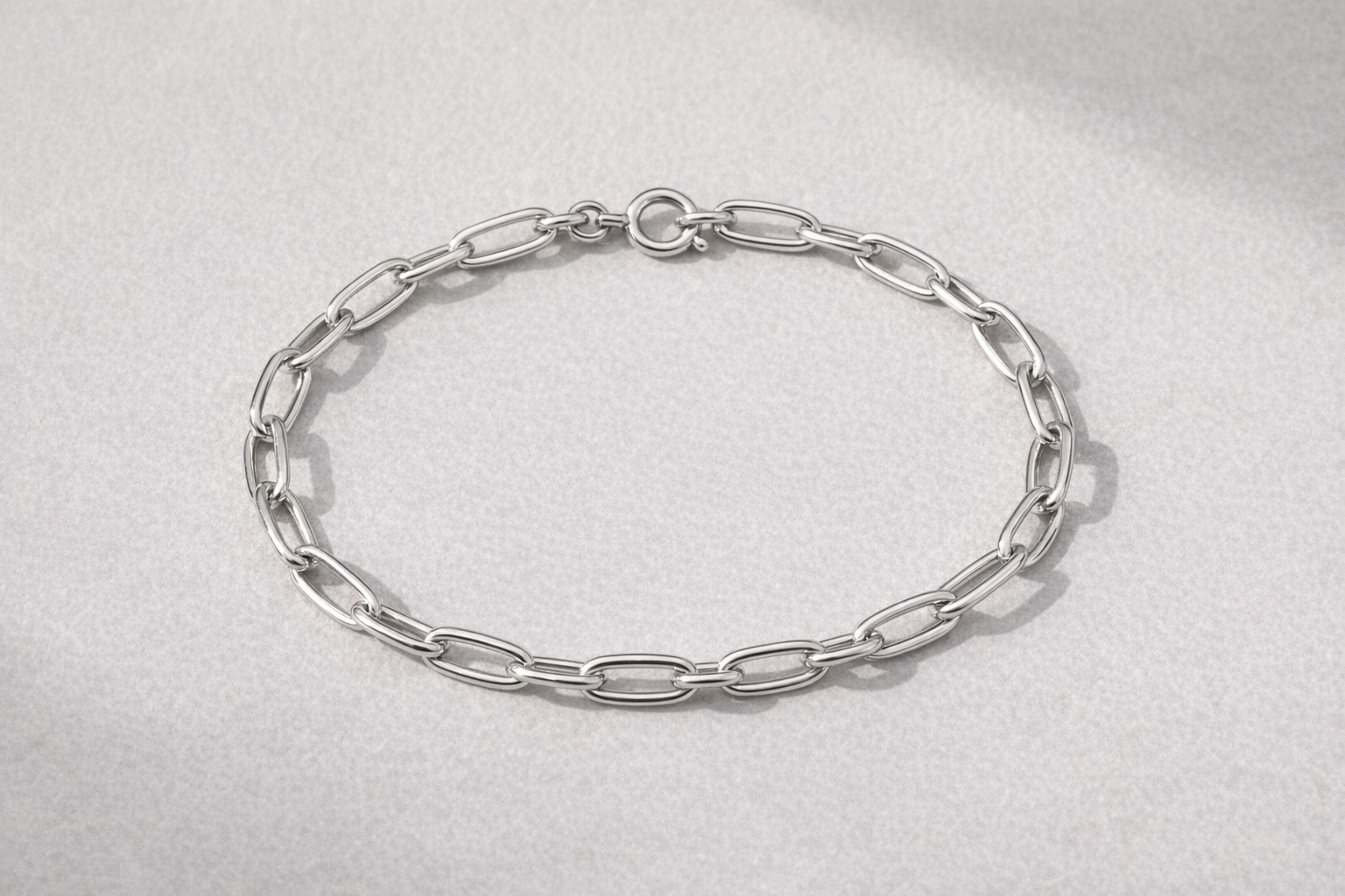 Pulseira em prata com elo alongado, produzida artesanalmente com atenção à estrutura, proporção e acabamento. Modelo versátil, indicado para uso diário e disponível em diferentes comprimentos